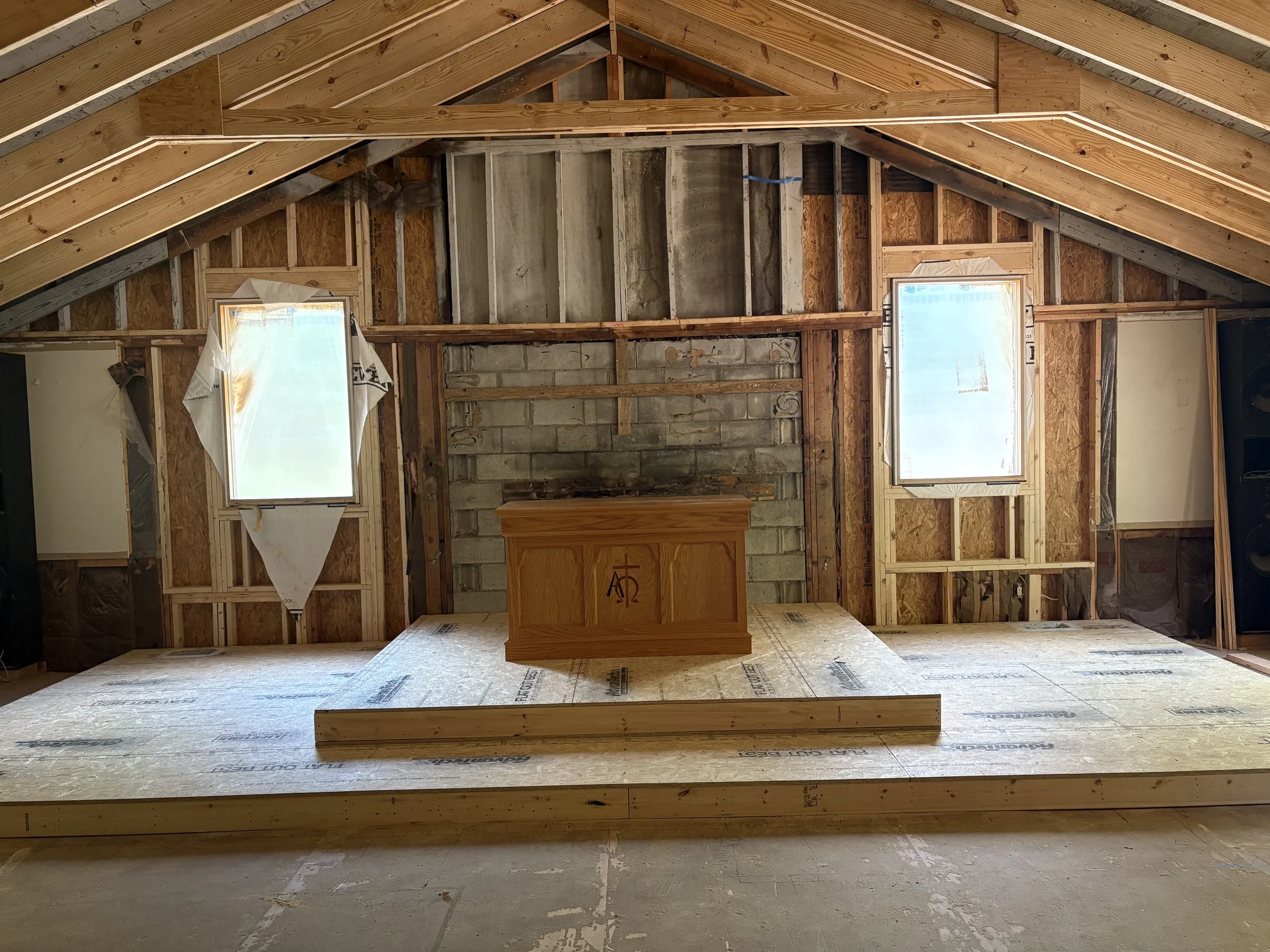 The ceiling has been raised in the sanctuary and the electricians are to finish installing electricity to canned lights in coming days. Then the foam insulation will be put in and drywall completed everywhere needed.