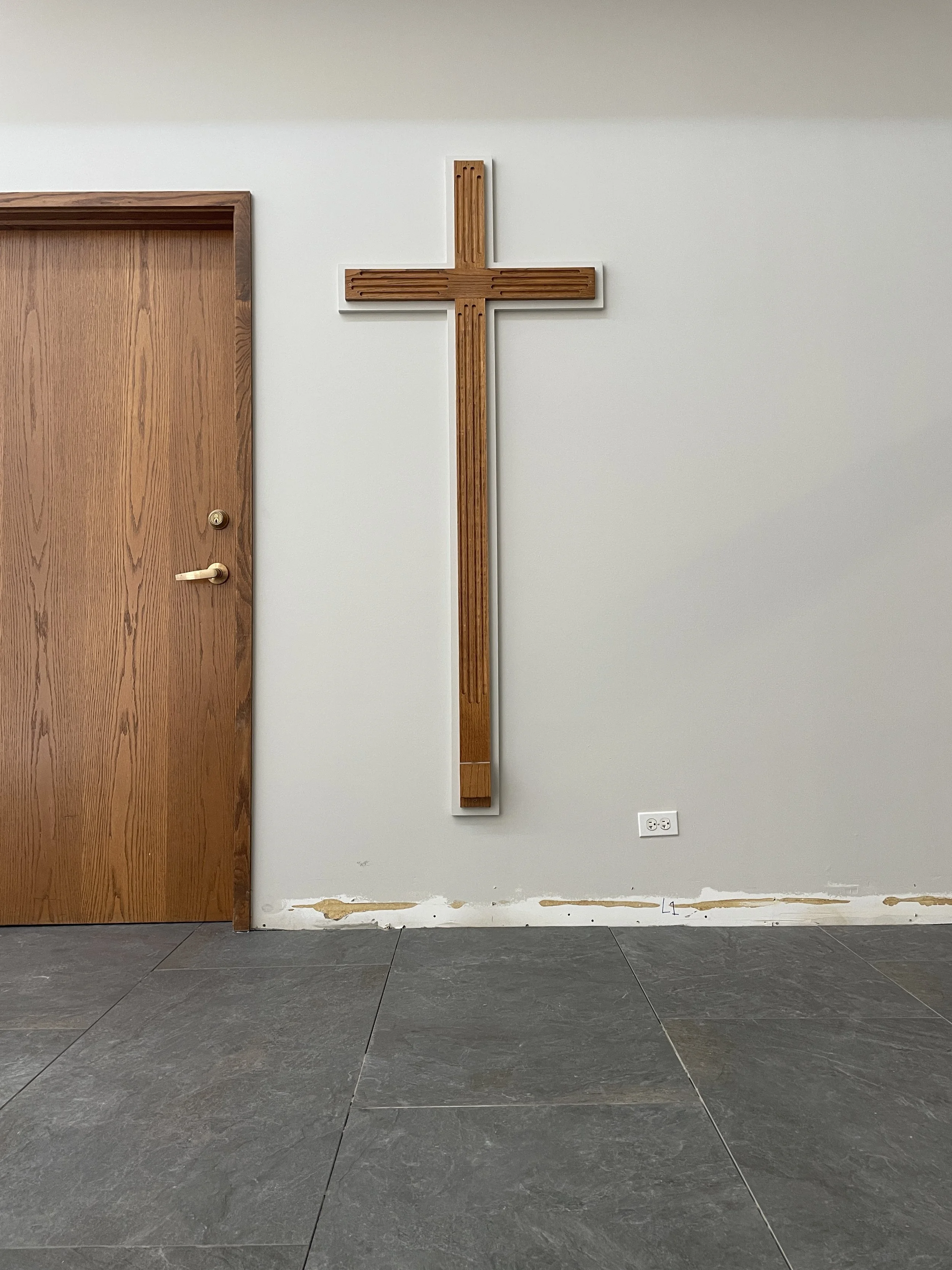 We chose a slightly lighter shade for the panels behind Jesus and the cross. Look up to the top to see the difference between the lighter shade and the overall shade. Also, the bronze Jesus statue and cross have had a much-needed thorough cleaning.